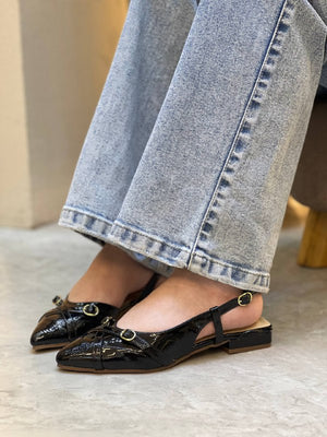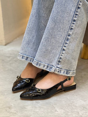 Esta baleta combina elegancia y comodidad, ideal para elevar tus looks diarios o complementar atuendos más sofisticados. Su acabado en charol aporta brillo y distinción, mientras que la correa cruzada con hebilla metálica brinda un toque femenino y seguro al caminar.