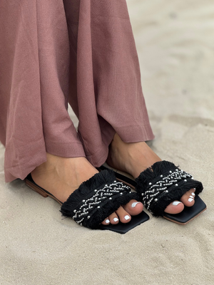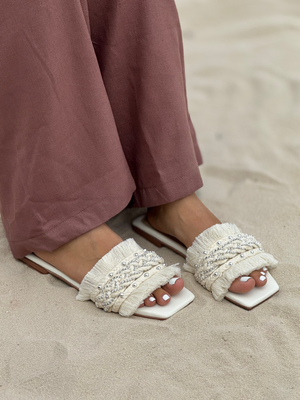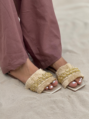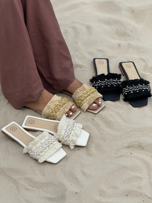 Sandalias modernas con diseño artesanal que combinan frescura, estilo y comodidad. Sus tiras decoradas con hilos y detalles brillantes realzan cualquier look, perfectas para acompañar tus outfits casuales o de verano.