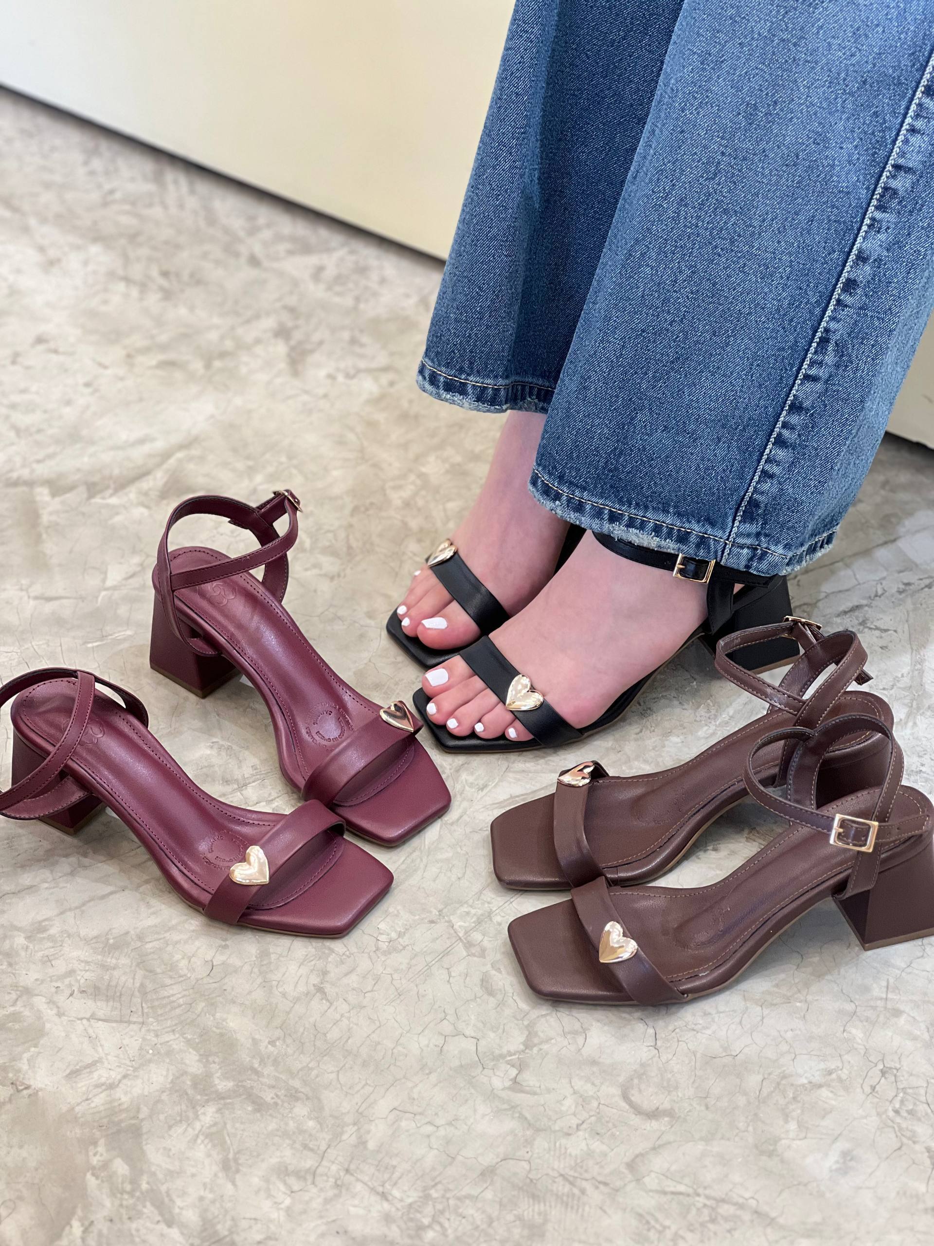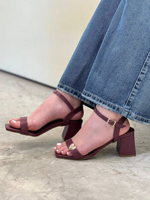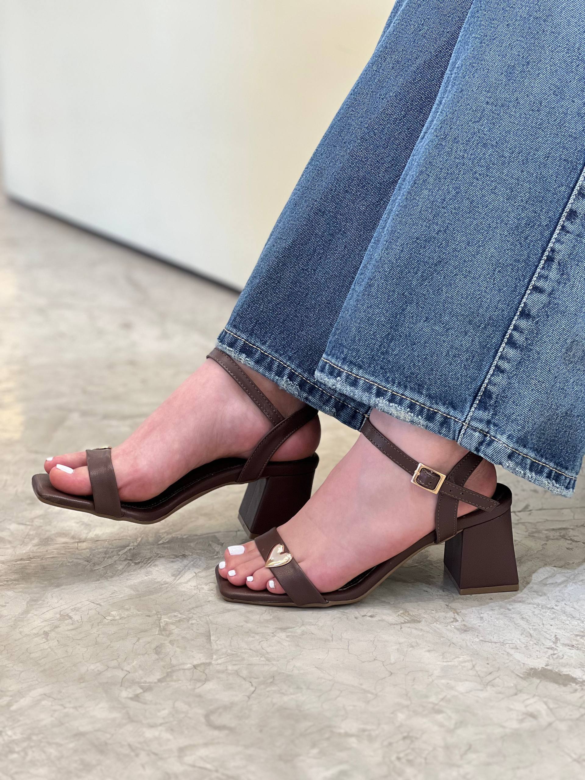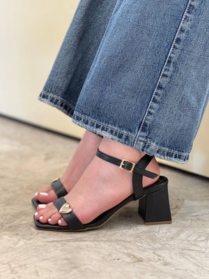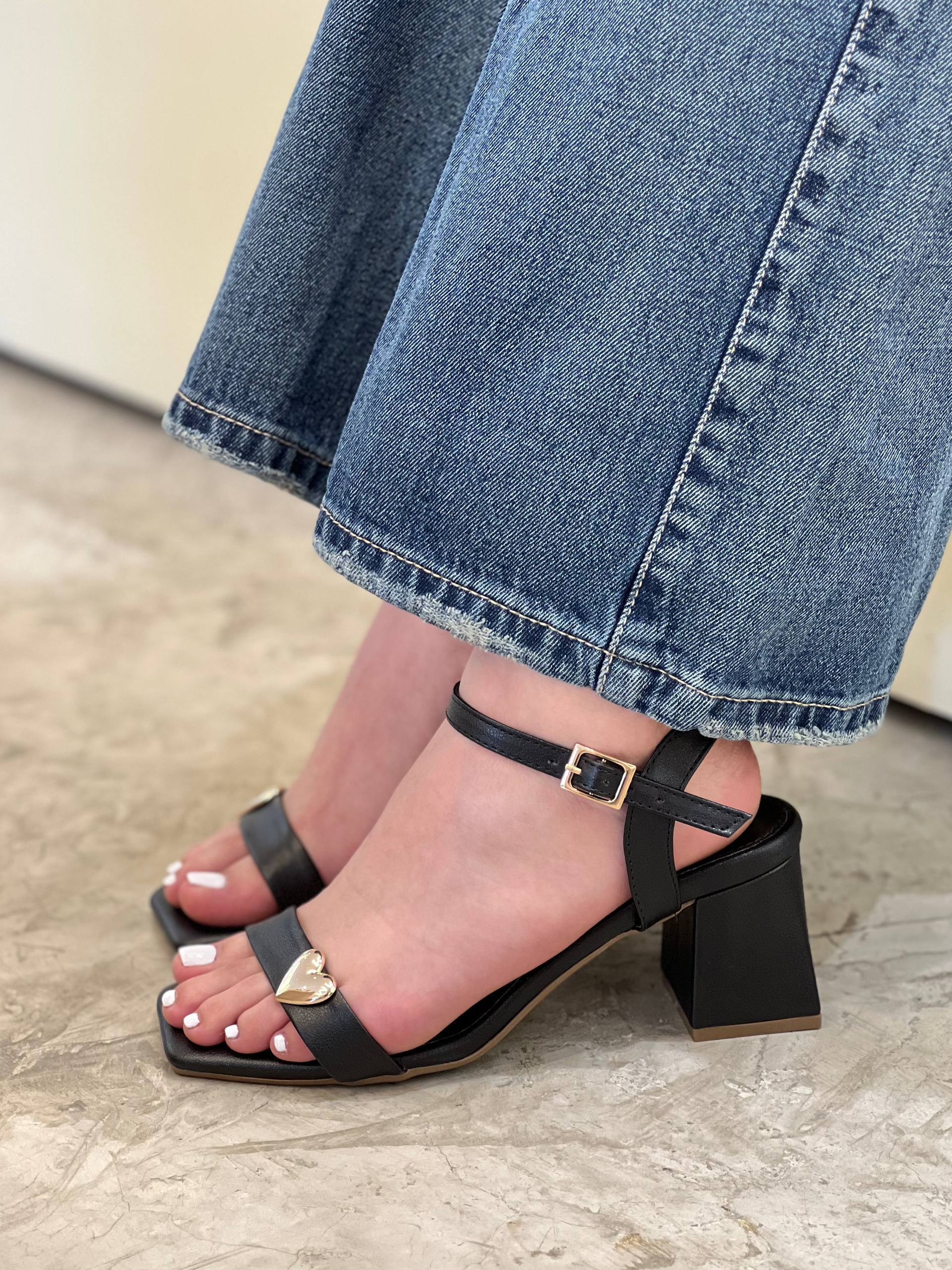 Sandalia de tacón con diseño elegante y femenino, destacada por su detalle metálico en forma de corazón que aporta un toque delicado y moderno. Cuenta con correa ajustable en el tobillo para un mejor ajuste y tacón ancho que brinda estabilidad y comodidad. Ideal para complementar desde looks casuales hasta outfits más sofisticados, convirtiéndose en un modelo versátil y lleno de estilo.