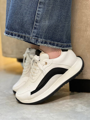 Estos tenis blancos con detalles en negro son un básico infaltable para un look moderno y versátil. Su diseño limpio con líneas curvas aporta un toque deportivo y urbano, ideal para combinar con jeans, pantalones amplios o outfits casuales del día a día. Gracias a su suela gruesa y estructura cómoda, ofrecen estilo y confort en cada paso.