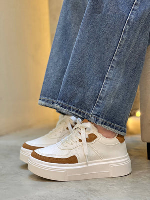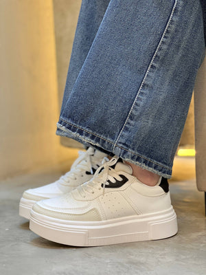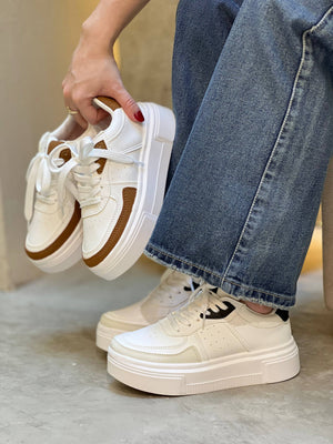 Tenis de plataforma estilo urbano, diseñados para elevar cualquier look con un toque moderno y limpio. Su combinación de tonos neutros los hace muy fáciles de combinar, mientras que la suela alta aporta altura, estilo y una pisada mucho más cómoda. Son ideales para el día a día, salidas casuales y looks relajados pero con estilo.