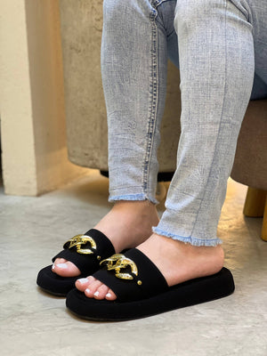 ¡Elegancia casual para todos tus días! 🖤👣 Estas sandalias negras con detalle de cadena dorada son el toque glam que tu outfit necesita. Su plataforma acolchada ofrece comodidad y estilo en cada paso. Perfectas para combinar con jeans, vestidos o looks relajados pero con mucha actitud. ✨👡 ¡Luce increíble sin renunciar al confort! 💫🔗