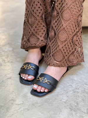 Estas sandalias planas tipo slide son el complemento perfecto para un look elegante, cómodo y atemporal. Su diseño minimalista se destaca por el herraje metálico decorativo, que aporta un toque sofisticado y moderno. Son ideales para el día a día, viajes o planes casuales donde buscas practicidad sin perder estilo.