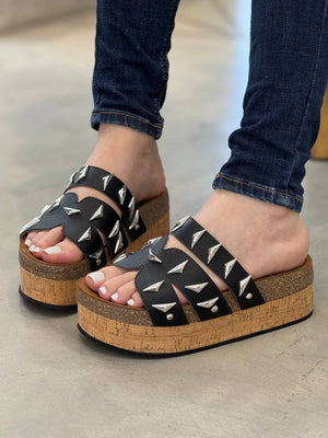 Una sandalia diseñada para quienes aman destacar. Su base tipo corcho y capellada en tono negro con apliques metálicos crean un equilibrio perfecto entre comodidad y carácter. Ideal para looks urbanos, casuales o con un toque rocker.